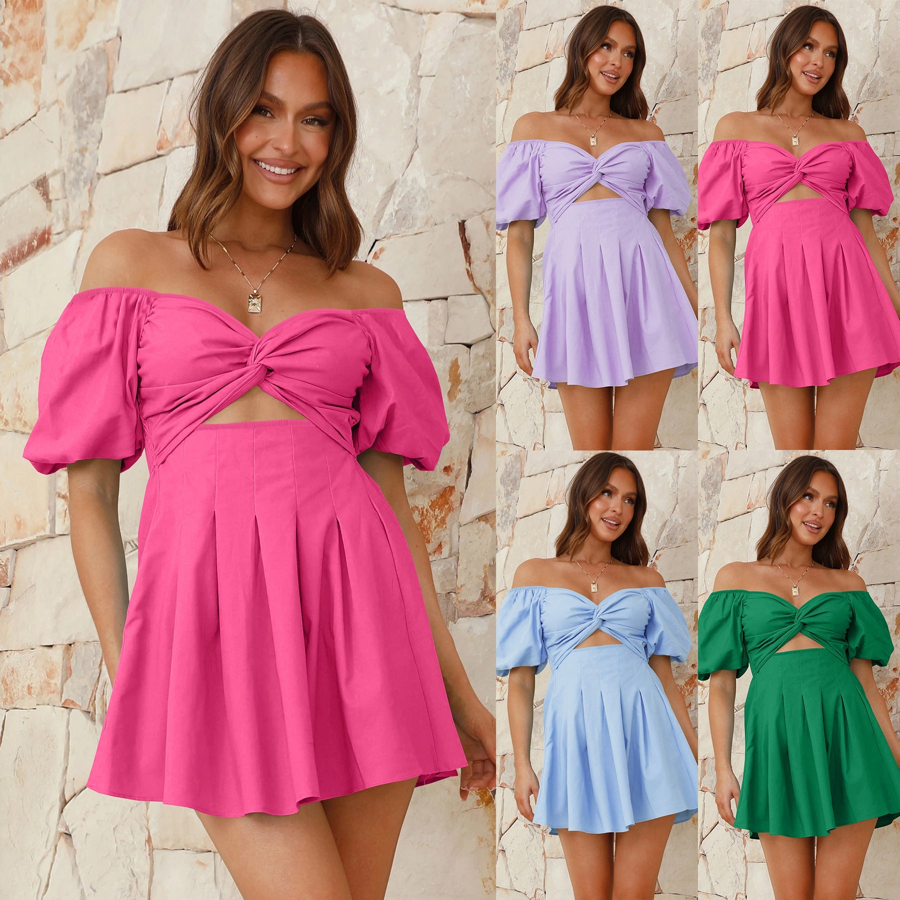 Turn heads and make a statement with this Sexy Off-the-shoulder Lantern Sleeve Pleated Dress. This stunning piece features a sultry off-the-shoulder neckline that beautifully accentuates your collarbones and shoulders, giving a flirty yet elegant look.